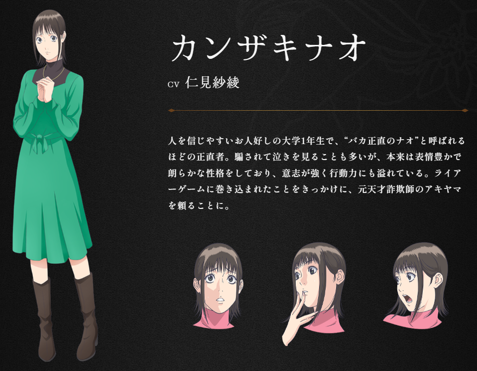 性格天真正直的女大學生神崎直(CV:仁見紗綾),收到了一個奇怪的包裹。 標註 LIAR GAME 事務所的寄件者告訴她,包裹中裝有總計一億元的日幣,神崎必須作為 1 對 1 其中一方玩家想辦法騙取另一方手上的資金,若是不幸落敗就會... 最后编辑由 不存在的铃喵