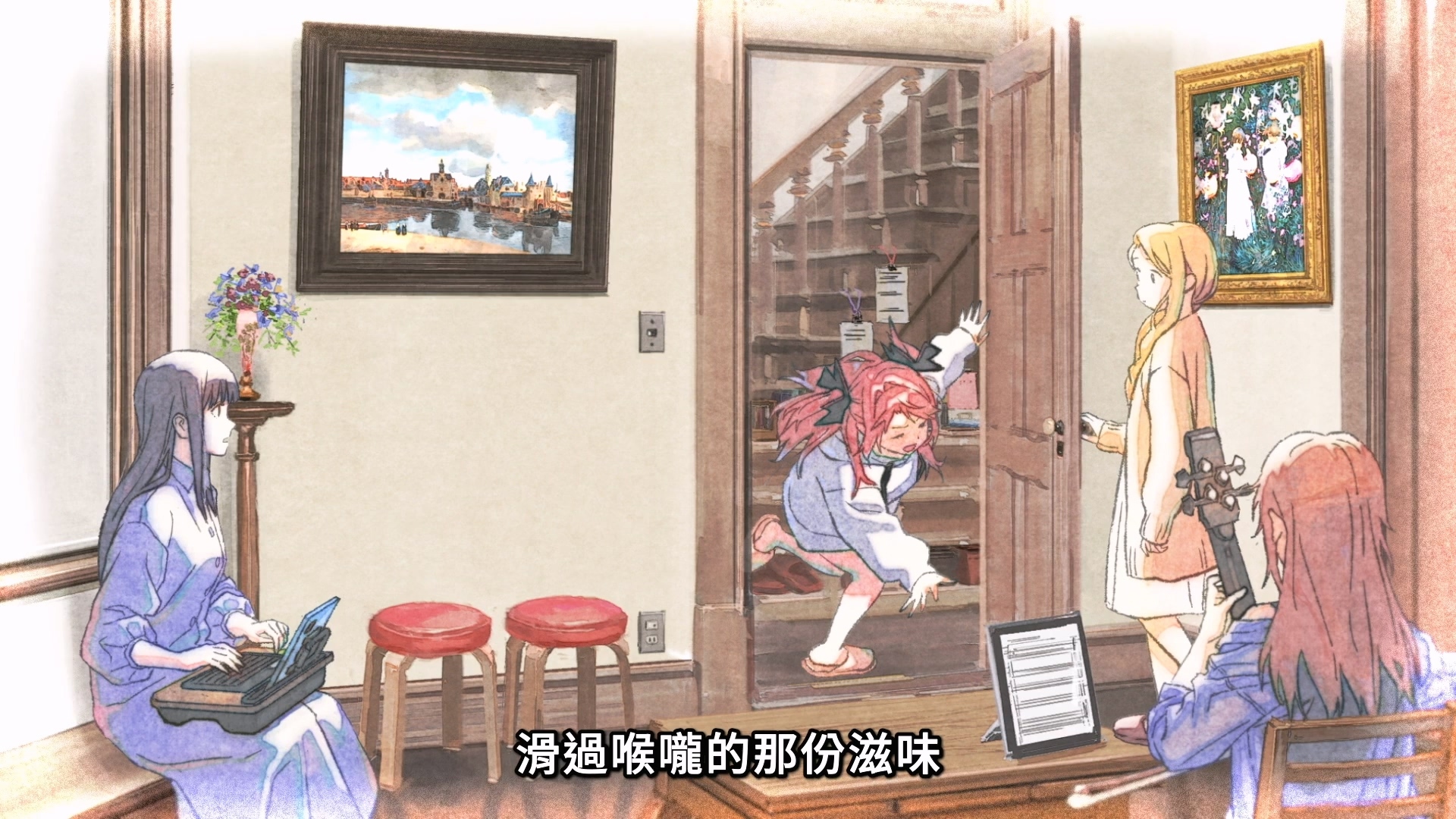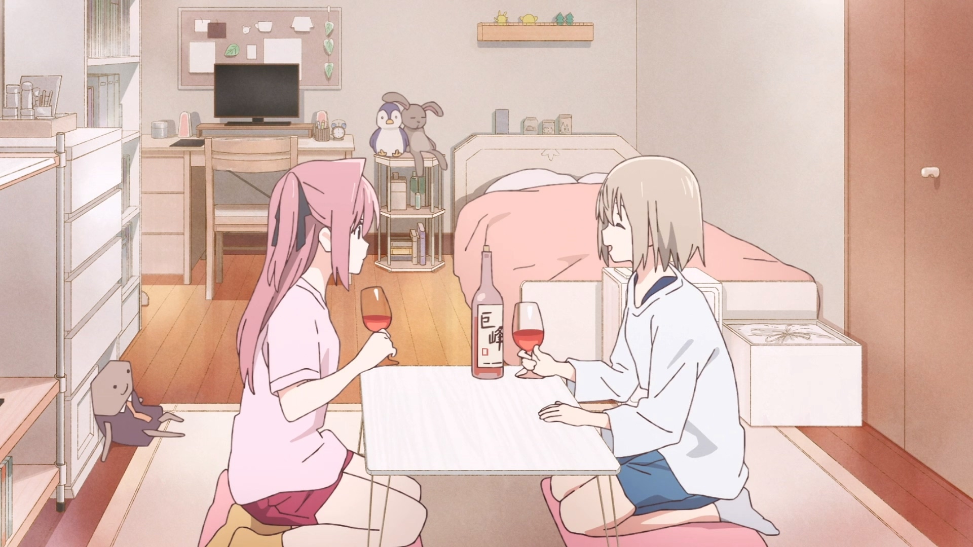 本作的故事基本上除了描写牡丹与伊吹那逐渐加剧的百合戏外,其实大部分时间都是人际向的群像剧,出游、聚餐、恋爱,就像大部分大学生的日常一般,酒只是作为其中的调剂,和进入抒情状态的开关。这部分动画版给出了比较轻松的诠释,可能会把主题限制在更纯粹的饮酒和百合主题,再透过镜头赋予更强的生活感。乍看之下好像会觉得有点缺乏主题和猛药,但或许这种“微醺”的状态,带著点苦涩的美好,也是作者想表达的饮酒的乐趣吧?(虽然原作后面文艺气息略重。但动画应该不会演到那部分就是了)