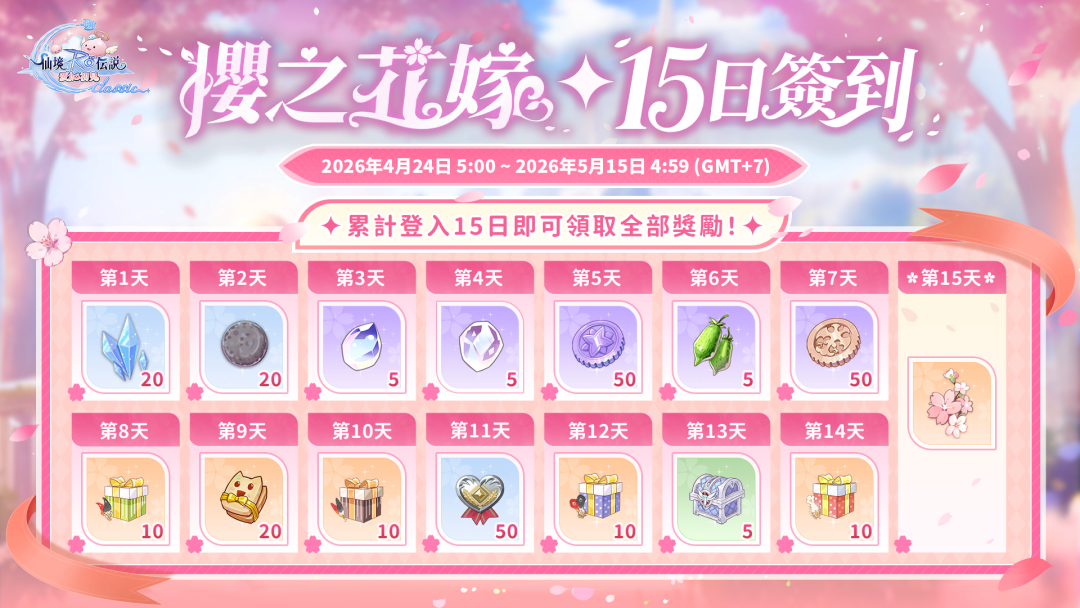 完成系列活动并累积 15 日签到,即可获得“樱花头饰”等限定造型,展现专属浪漫。